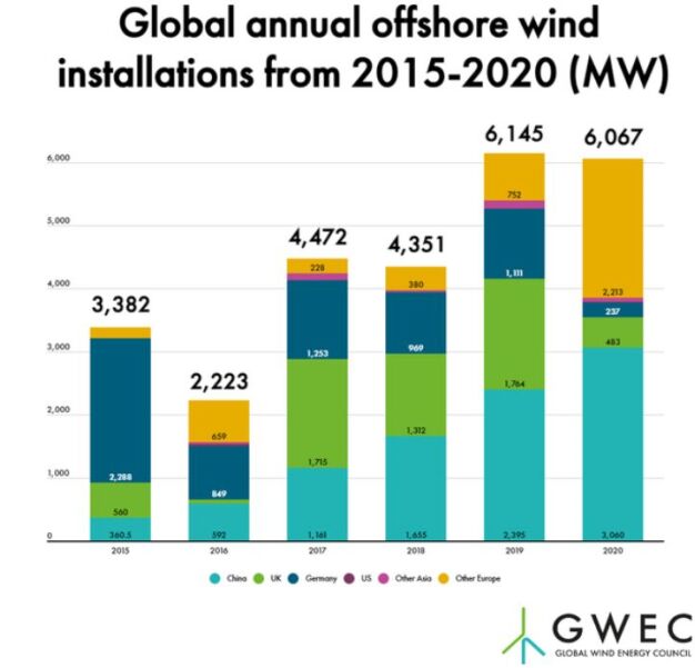 據(jù)全球風(fēng)能理事會GWEC(Globle Wind Energy,GWEC)最新報告,2020年,全球新增海上風(fēng)電裝機(jī)容量的一半來自中國。 絲路中心(BRICC)觀察到,海上風(fēng)電已是全球能源投資的熱點(diǎn)產(chǎn)業(yè)。目前海上風(fēng)電發(fā)展目前是什么態(tài)勢?全球資源情況如何?今后將如何發(fā)展?我們應(yīng)該采取什么策略? 本篇文章,絲路中心(BRICC)根據(jù)公開資料對以上問題進(jìn)行分析,并提出相應(yīng)的工作建議。 文章要點(diǎn) •全球海上風(fēng)電發(fā)展呈現(xiàn)進(jìn)入爆發(fā)期。后續(xù)還會有越來越多的國家出臺支持政策,發(fā)展還將加快。中國連續(xù)三年海上風(fēng)電新增裝機(jī)量處于世界領(lǐng)先地位,2020年新增海上風(fēng)電裝機(jī)量超過3GW,占全球增量一半以上。 •中國近年已經(jīng)成為全球海上風(fēng)電發(fā)展的領(lǐng)頭羊,今后還將繼續(xù)加大力度。歐洲國家,韓國、越南等亞洲國家也在持續(xù)發(fā)力。 •全球海上風(fēng)電具有巨大的發(fā)展空間。隨著單機(jī)容量不斷增大、制造和安裝成本的持續(xù)下降,海上風(fēng)電將越來越具備商業(yè)競爭價值。 •在一些海上風(fēng)電資源豐富的國家,在其政策將明未明之時,及時搶占資源好的風(fēng)電場并連續(xù)開發(fā),是當(dāng)前海外電力投資的重要方向。 •未來提高競爭力,海上風(fēng)電+儲能、海上風(fēng)電+制氫等模式,也是應(yīng)該考慮的可持續(xù)發(fā)展模式。 1 中國海上風(fēng)電行業(yè)進(jìn)入爆發(fā)期 根據(jù)全球風(fēng)能理事會(Global Wind Energy Council,GWEC)發(fā)布的最新數(shù)據(jù)顯示,2020年全球海上風(fēng)電新增裝機(jī)量超過6GW,盡管受到新冠疫情影響,但風(fēng)電發(fā)展在能源行業(yè)中保持良好勢頭,成為有史以來第二好的年份,詳見圖1、表1。 總體而言,目前全球海上風(fēng)電裝機(jī)總?cè)萘恳殉^35GW,在過去5年中增長了106%,詳見圖2、表2。