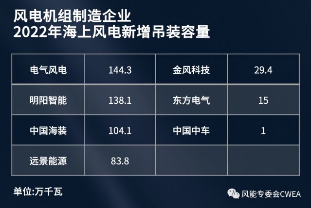 2022年,中國新增吊裝容量前五的風電機組制造企業是金風科技、遠景能源、明陽智能、運達股份、三一重能,其新增裝機容量分別為1136萬千瓦、782萬千瓦、621萬千瓦、610萬千瓦、452萬千瓦。