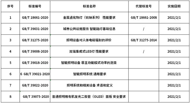 近日,國家市場監(jiān)督管理總局(國家標準化管理委員會)批準發(fā)布一批重要國家標準,其中推薦性標準199項,涉及照明、家居用品、民用飛機、智能制造等諸多領(lǐng)域。 其中,照明類包括“照明設(shè)備對人體電磁輻射的評價”、“雙端集成式LED燈 性能要求”等8項相關(guān)的國家推薦性標準。本次發(fā)布的照明相關(guān)標準將于2021年2月1日起正式實施。