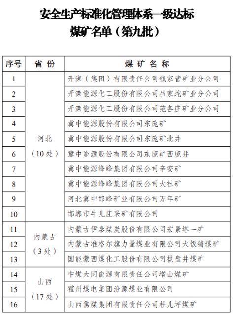 12月25日,國家礦山安全監(jiān)察局關于公布安全生產(chǎn)標準化管理體系一級達標煤礦名單(第九批)的通知。其中,53處煤礦在標準化一級等級有效期內(nèi)享受激勵政策,詳情如下: