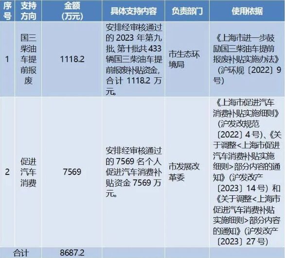 2、按照《上海市促進汽車消費補貼實施細則》(滬發改規范〔2022〕4號)、《關于調整<上海市促進汽車消費補貼實施細則>部分內容的通知》(滬發改產〔2023〕14號)和《關于調整<上海市促進汽車消費補貼實施細則>部分內容的通知》(滬發改產〔2023〕27號)規定,安排經審核通過的7569名個人促進汽車消費補貼資金共計7569萬元。
