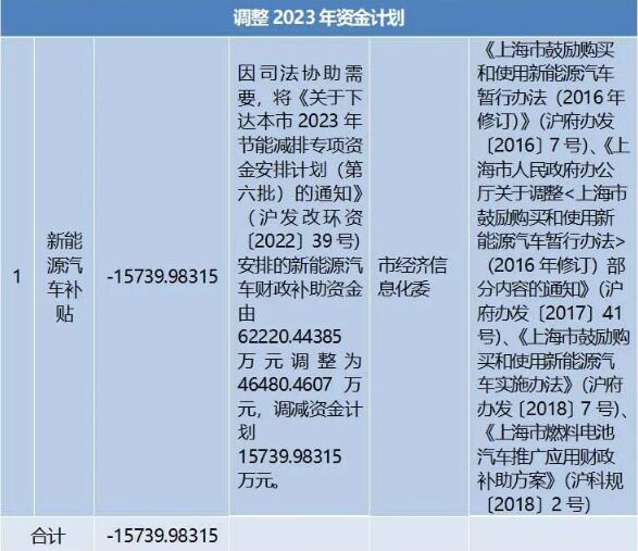 1、因司法協助需要,將《關于下達本市2023年節能減排專項資金安排計劃(第六批)的通知》(滬發改環資〔2022〕39號)安排的新能源汽車財政補助資金由62220.44385萬元調整為46480.4607萬元,調減資金計劃15739.98315萬元。