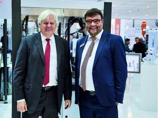 *Plasmatreat 公司 CEO Christian Buske(右)和德國倍福自動化有限公司總裁(左)對基于 XPlanar 的等離子處理裝置在 2019 年德國杜塞爾多夫橡塑展 K 展上的成功亮相感到高興