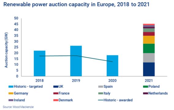 在經(jīng)歷了動蕩的2020年之后,歐洲電力市場有望迎來較為樂觀的2021年。在新的一年里,歐洲各國的政策制定者和市場參與者將在歐美綠色協(xié)議的指引下,向著零凈排放的目標有效推動實質(zhì)性的進程。預(yù)計2021年歐洲可再生能源競標將創(chuàng)下新的記錄。 根據(jù)Wood Mackenzie最新的一項分析,2021年歐洲計劃競標的總?cè)萘扛哌_45GW,其中包括17GW的風(fēng)電,6GW的光伏發(fā)電,以及技術(shù)中立的或多種可再生能源混合技術(shù)。 以往的競拍結(jié)果表明,中標總量可能低于目標值。在過去的三年里,歐洲競標的平均成交率為70%,也就是說,2021年極有可能最終落地30GW的發(fā)電容量。