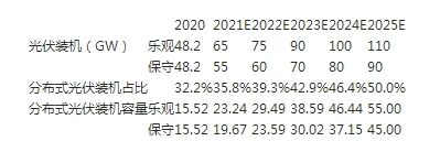 二、分布式光伏蘊含萬億級的市場潛力 從后續光伏裝機容量的角度看,分布式光伏具有較大的上升空間。根據CPIA(中國光伏協會)預測,我國光伏新增裝機容量較“十三五”時期有望實現大幅增長,到2025年,我國光伏新增裝機容量有望達到90-110GW,2021-2025年新增光伏裝機量復合增長率有望達到13.3%-13.7%。 十四五期間,分布式光伏電站有望迎來大幅增長。我國2016年的能源十三五規劃中曾指出,到2020 年,太陽能發電規模達到 1.1 億千瓦以上,其中分布式光伏 6000 萬千瓦,占比達到55%。但從中國光伏協會公布的數據來看,2020年,我國集中式電站占比67.8%,分布式電站占比為 32.2%,分布式光伏電站的占比沒有達到十三五規劃的目標,預計十四五期間,分布式光伏將迎來較快發展。 據國家能源局公布數據,2020年,我國新增光伏裝機量為48.20GW,其中集中式光伏為32.68GW、分布式光伏為15.52GW,分布式中戶用光伏 10.10GW、工商業 5.42GW,2020年分布式新增裝機容量重拾升勢,同比增長27.21%。 CPIA也預測,未來我國分布式光伏電站的比例將呈上升趨勢,樂觀情況下,到2025年,我國分布式光伏新增容量有望達到55GW,占比達到50%,其中工商業分布式為41.25GW,占分布式新增裝機容量的75%。 分布式光伏新增裝機容量預測