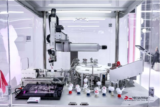 此次參展,三菱電機帶來了多項科技感和趣味性十足的打卡互動體驗,吸引了大批觀眾駐足,最吸睛的莫過于高爾夫球繪圖包裝展機。通過五軸聯動運行、二維平面轉換三維球面軌跡算法、數字孿生等核心技術,機械控制臂可在半徑為21.3mm的高爾夫球面進行精細繪畫,不到2分鐘即可完成高爾夫球上的繪畫與制盒包裝,引發現場陣陣驚嘆。三菱電機通過生動形象的方式,將自己的高精密智能制造能力完美展現。